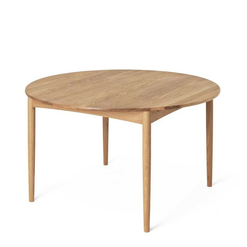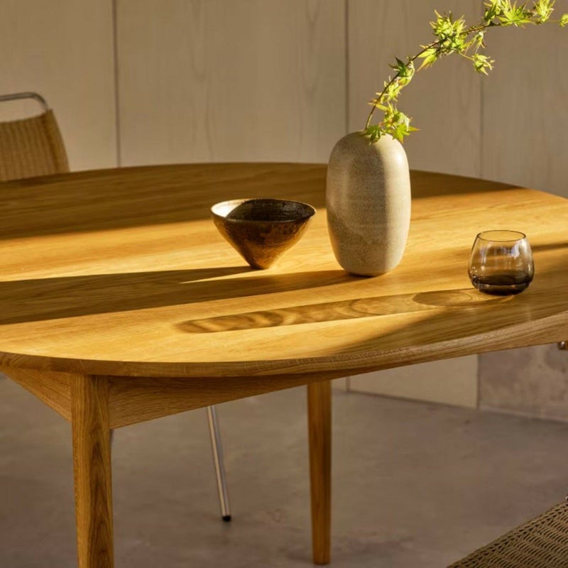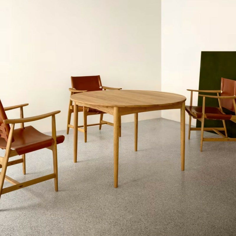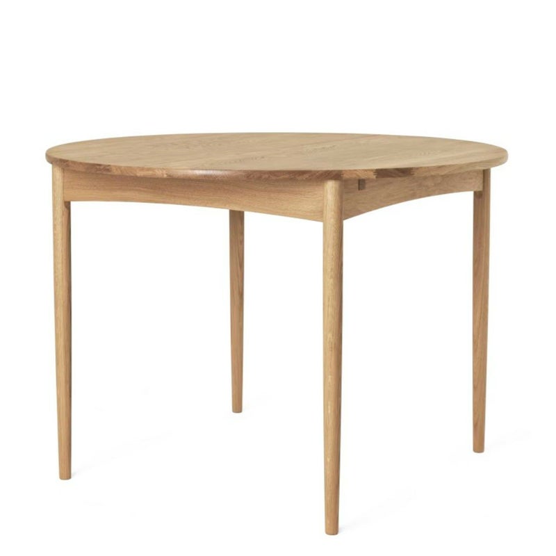 商品説明ボーエ・モーエンセンは、1952年に小さな生活空間を活かせる家具として、4~6人で使用できるBM0121ダイニングテーブルをデザインしました。Carl Hansen & Snのコレクション中初の伸長式円形テーブルとなる、このモーエンセンのテーブルは、無垢のFSC認証オーク材を使用し、厚さ19mmのテーブルトップ、わずかに先細りの脚、上向きにカーブした枠が非常に軽快な印象を与えます。インサートリーフには、オークオーク材または中質繊維板 (MDF) の2種類があります。
