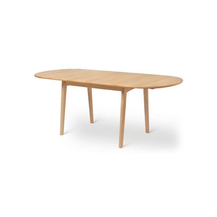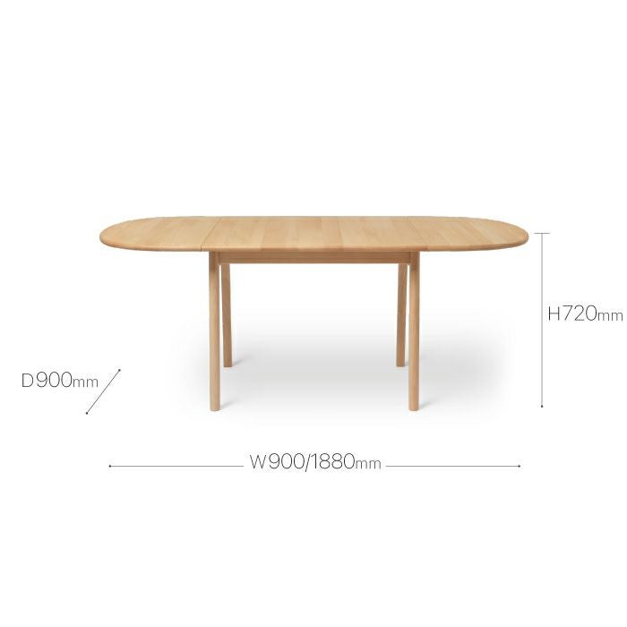 折りたたみできる半円型の伸長板により、3段階の長さ調整が可能です。伸長なしの90cm、片側だけ伸長させた139cm、両側伸長させた188cm。場面に応じての拡張も手軽にできる利便性は、食事だけにとどまらない使い方のインスピレーションを与えてくれます。