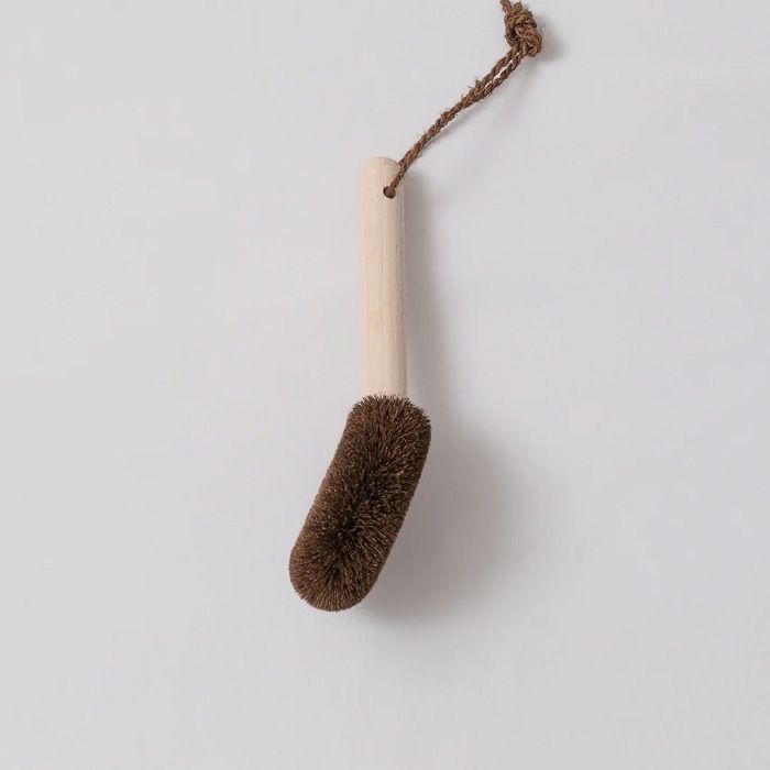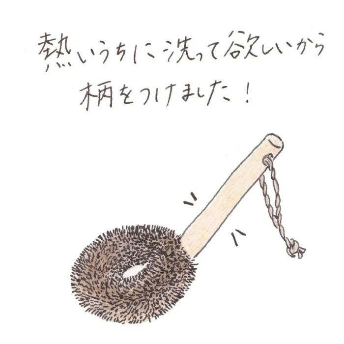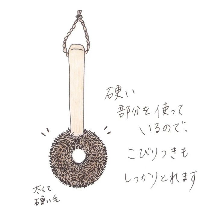 商品説明フライパン専用のたわしです。しゅろの中にはごく一部、「鬼毛」といわれる特にかたい部位があります。その鬼毛だけを使用した、高田耕造商店のラインナップの中で最もかたいたわしです。鉄のフライパンはもちろん、焦げ付き防止加工済みのフライパンにも使用でき、さらに土鍋やグリル鍋のこびり付きまでしっかり取ることができます。鉄のフライパンに使用する際は殆どの場合洗剤を使用しないことが望ましいので、フライパンに熱があるうちに、強めの流水で流しながら一気にたわしで擦り洗いして下さい。柄がついていますが、火傷には充分注意して下さい。使用後のたわしは油を含んでおりますので、洗剤等を含ませ手で揉むように泡立てて洗って下さい。真ん中に穴が空いているので、中まで洗いやすく、また水切れも良いです。