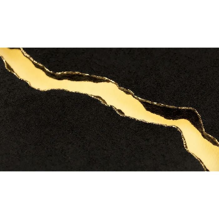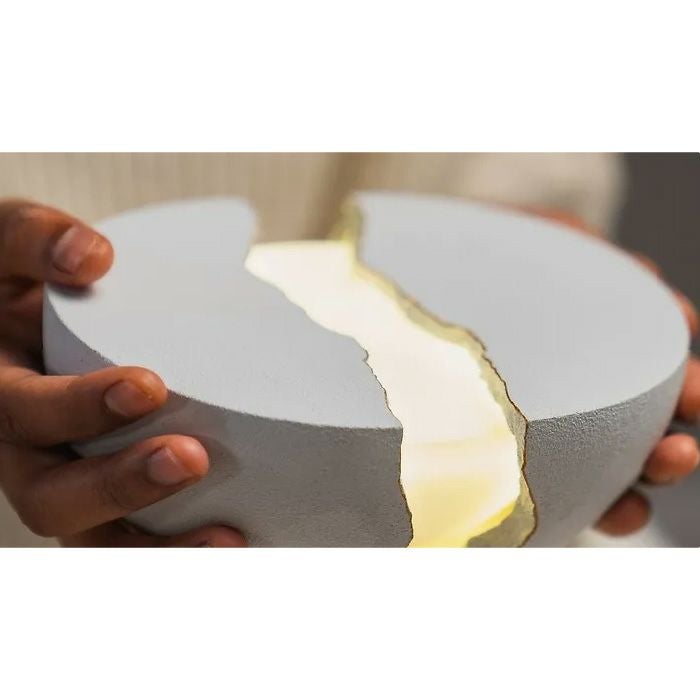 この割れの部分は、日本の伝統技法である「金継ぎ」にインスパイアされ、