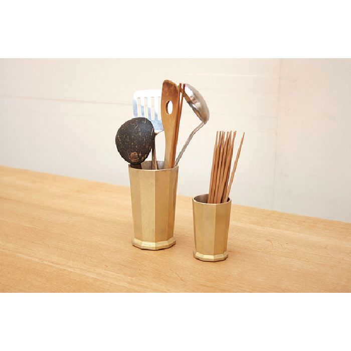 商品説明真鍮の重さと耐久性を活かした、倒れにくい道具立て。お玉や菜箸やカトラリーなど背の高いものを沢山たてても、重心が低いので倒れにくくなっています。内側の仕様は錫メッキ有・無が選べるようになりました。キッチンツールやカトラリー用として清潔に保ちたい場合には錫メッキ有りがおススメです。工具や文具をメインに使用される場合は、内側にメッキがされていなくても問題なくお使いいただけます。用途に合わせてお選びください。底面にはシリコンシールを付けているので、接地面を傷めることもありません。花瓶やペンスタンドとしてもご使用いただけます。