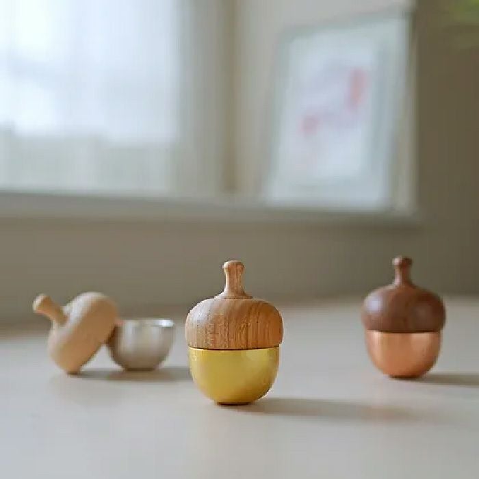 どんぐりの中にしまわれた振り子でおりんを鳴らします。(特許出願中)木製の蓋をつまみ振り子で鳴らす動作は、多忙な日常を忘れさせてくれるような丁寧で心落ち着くひとときを感じさせてくれます。 可愛らしいデザインにマッチした、澄んだ明るい音色です。