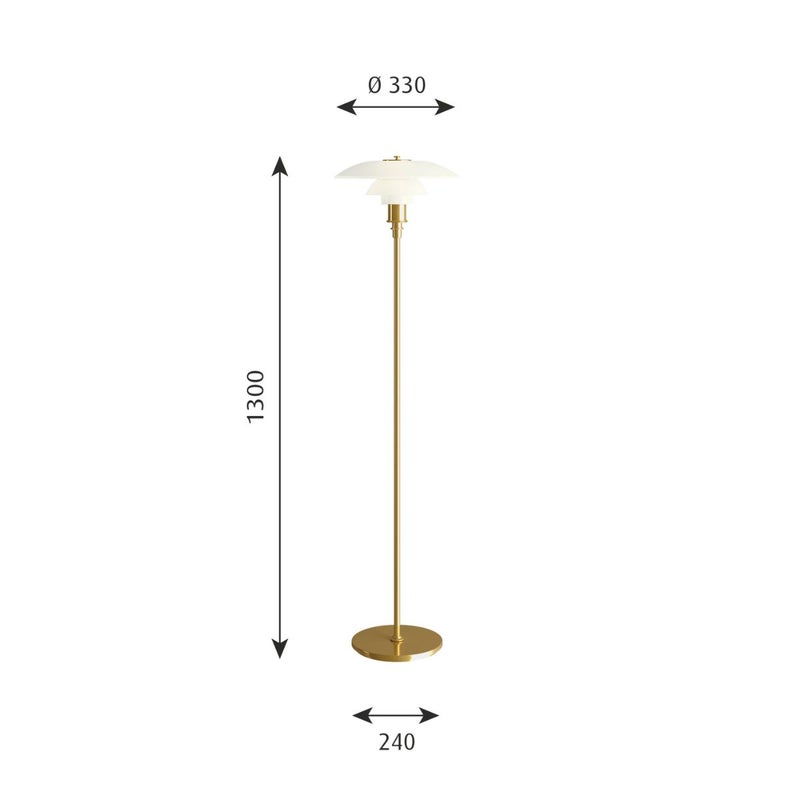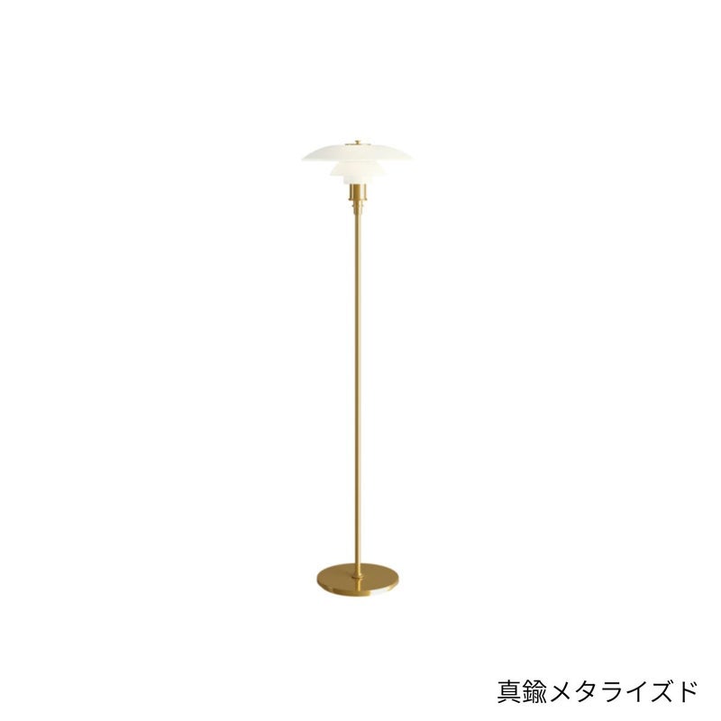 商品説明1925年から1926年にかけて、ポール・ヘニングセンは3枚シェードのシステムによる照明器具を開発しました。PHの最初の複数シェードのランプは、パリで開催された展覧会のために、ルイスポールセンと共同でデザインされました。両者のパートナーシップは、ヘニングセンが亡くなる1967年まで続きました。グレア・フリーの光(眩しさの除去)、明るさが最も必要とされる場所に光を届けること、同時に柔らかい影をつくりだすこと。これらが、生涯を通じてPHが追及した重要テーマで、その光源は当時の白熱電球でした。今日、3枚シェードのPHシリーズには屋外用の3種を含む18種類のランプがあり、PH 3-2 フロアランプもそのひとつです。PHが設計したのは単なるランプではなく、包括的な照明システムであり、長年にわたり1000種にわたるモデルが生まれました。そこにはウォールランプ、テーブルランプ、フロアランプはもとより、天井の高い住宅用として1930年代にポピュラーとなったシャンデリアの数々も含まれます。たくさんの組み合わせやオプションもありました。色やサイズのヴァリエーションも豊富でした。初期のシェードは金属製で、内側を白、ゴールド、シルバーなどで塗装し、拡散する光、温かみのある光、クールな光など、使用場所に応じて仕上げを選択するようになっていました。その後、3枚シェードシステムにガラスが加わりました。乳白ガラスのシェードは、光を下方に集めると同時に、程よく部屋の上方も照らしだしました。PHは、照明器具のデザインに科学的アプローチを採用し、シェードの曲線に対数螺旋を使用した最初の人物でした。対数螺旋に基づくデザインを採用することで、シェードの曲面全体にわたってなだらかな配光を得ることに成功したのです。このなだらかな配光は、シェード内面が反射する拡散光と合わさって、グレアと影のコントロールを可能にしました。各シェードが反射する光量は、光源との距離が大きくなるにつれ均等に減少します。PH ランプのモデル番号は、シェードのサイズを表しています。最初の数字はトップ・シェードのサイズ(直径)を表し、次の数字はミドル・シェードと下部シェードのセットを表します。2/2というような「原型」モデルでは、直径約20 cmのトップ・シェードに、それに対応するミドル+下部シェードがセットされています。PH 3-2 フロアランプは、直径約 35 cm のトップ・シェードに、 2モデルのミドル+下部シェードのセットを組み合わせています。こうした「ハイブリッド」モデルは、ペンダントを低く吊るしたいという要望に応えてデザインされました。このシステムは、フロアランプ、テーブルランプ、ウォールランプにも使われています。現行の PH 3-2 フロアランプは2002年に発売されました。