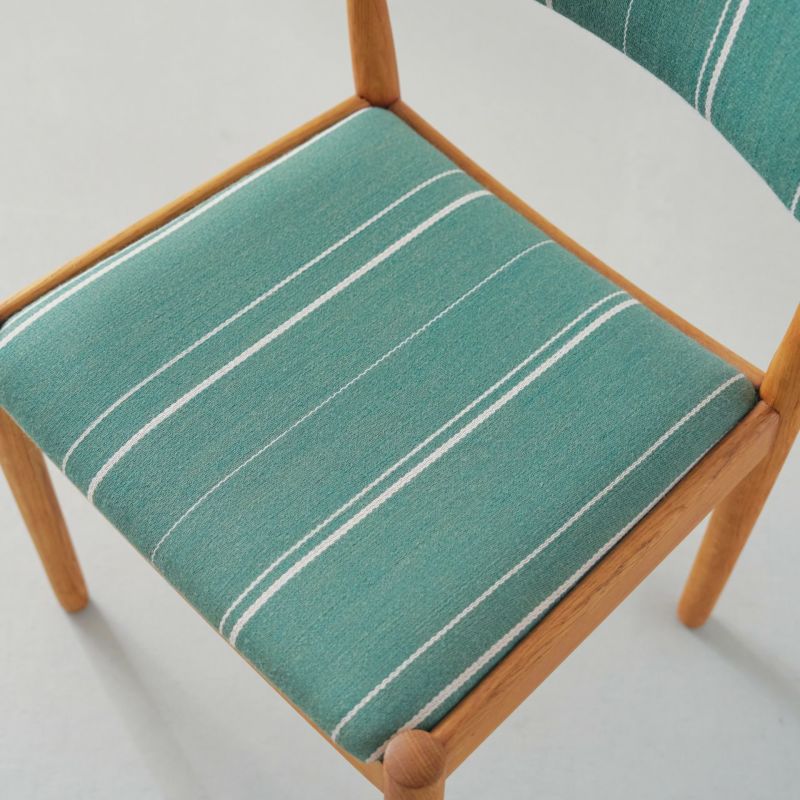 商品説明デンマークのデザイナー、ポール・M・ボルターによる「J61チェア」。FDB社で製造された北欧ヴィンテージの名作チェアです。 曲線を活かした背もたれと、シンプルながら洗練されたデザインは、座る人の体に優しくフィット。美しい木の質感と無駄のないフォルムが、どんな空間にも自然と溶け込みます。 シンプルで丈夫なつくりは日常使いにぴったり。ダイニングはもちろん、デスクチェアやリビングのサイドチェアとしてもおすすめの一脚です。 張替に使用した生地はDanish Art Weaving(デニッシュアートウィーヴィング)のUrd Stripe。製造当時から採用されておりデンマークの伝統的な生地です。 細かいキズなどはありますが、とても良いコンディションです。