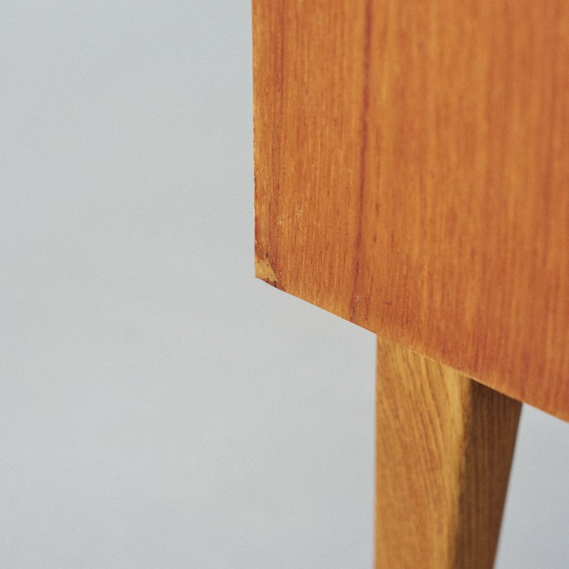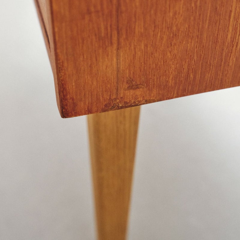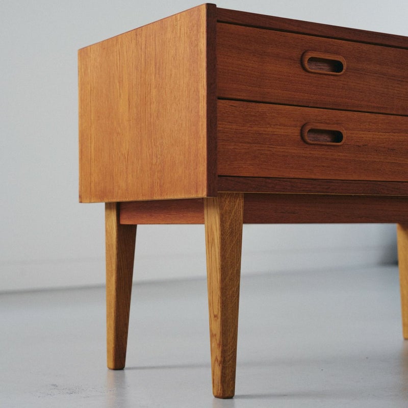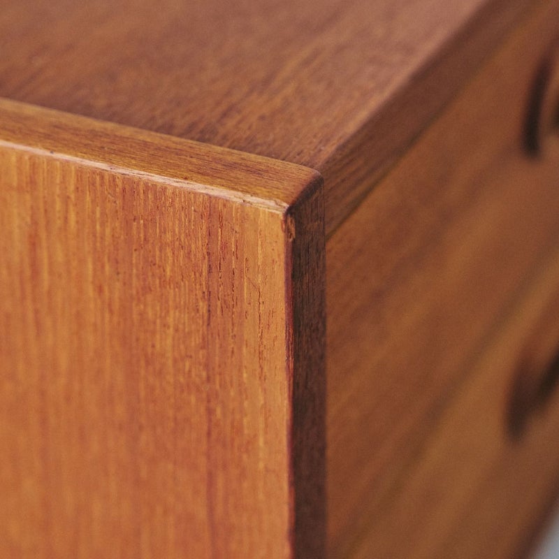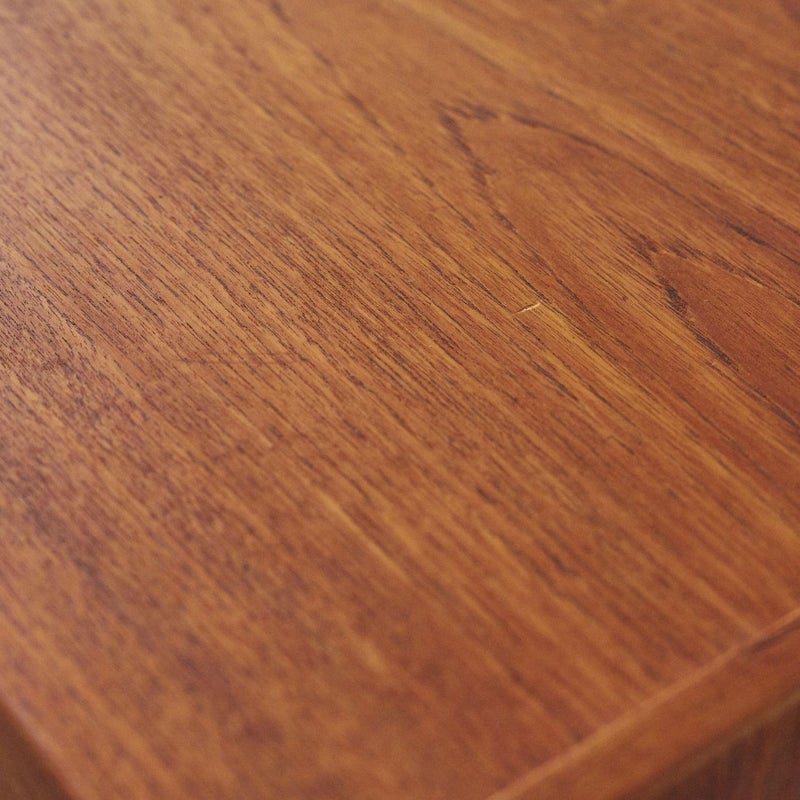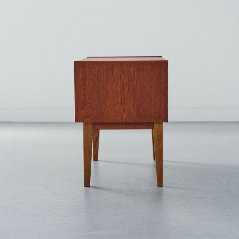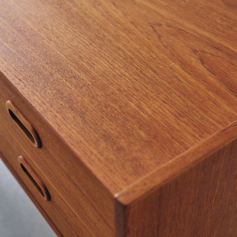商品説明すっきりとしたフォルムが魅力の北欧ヴィンテージチェスト。4段の引き出しが備わったシンプルなデザインで、収納力も十分です。 温かみのあるチーク材で脚はオーク材が使用されており、シンプルで飽きのこないデザインは、長くご愛用いただけるヴィンテージ家具の魅力のひとつです。 丸みのある取っ手や脚部のバランスなど、細部まで丁寧に作り込まれており、使い込むほどに木の味わいが深まります。 寝室やリビング、玄関など、一人暮らしのテレビボードとして、日常使いにちょうどいいサイズ感で、北欧インテリアのアクセントとなります。 画像のように天板にわずかなキズと側面に小さな欠けを補修した跡がありますが全体的にはとても良いコンディションです。 ※オイル仕上げの家具は、自然な風合いが魅力ですが、水分によって輪ジミができることがございます。クロスやコースターをご使用いただくことで、美しい状態を保てます。