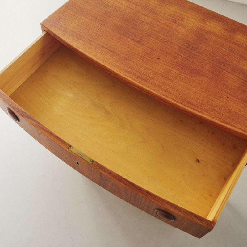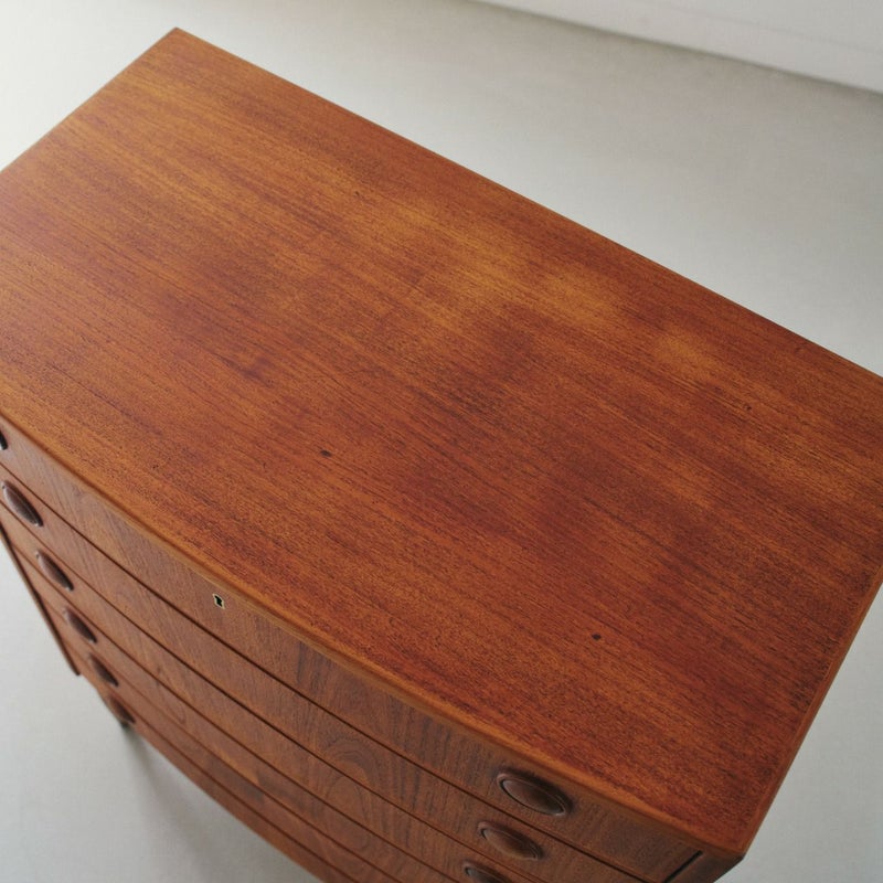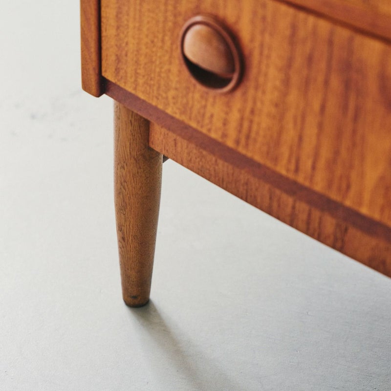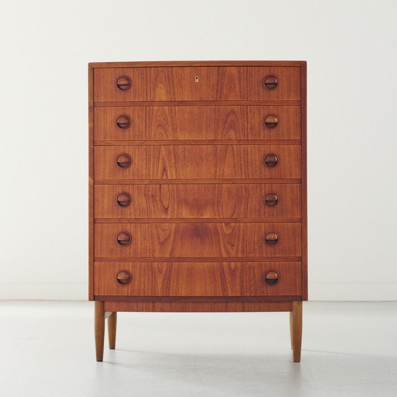 商品説明デンマークのデザイナー、Kai Kristiansen(カイ・クリスチャンセン)による6段チェスト。洗練されたフォルムと実用性を兼ね備えた、北欧ヴィンテージならではの名品です。 前方にアールを取ったデザインと特徴的な取っ手のデザインは、カイ・クリスチャンセンを象徴するディテールのひとつ。チーク材の木目が美しく、経年変化により深まった風合いと、北欧モダンの思想が息づくタイムレスなデザインです。 6段の引き出しは、見た目以上に収納力があり、衣類や小物の整理にも便利で寝室やリビングはもちろん、ショップ什器としても映える一台です。 天板に画像のようなキズや色むらがありますが、その他目立つダメージは無く良いコンディションです。 ※オイル仕上げの家具は、自然な風合いが魅力ですが、水分によって輪ジミができることがございます。グラスや花瓶を置く際はクロス等をご使用いただくことで、美しい状態を保てます。 ※こちらは鍵は付属していません。