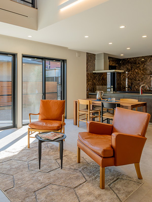 レザーのラウンジチェアに包まれ一人一人がゆったりとくつろぐ。 ソファをあえて置かないことが、非日常感をより演出します。