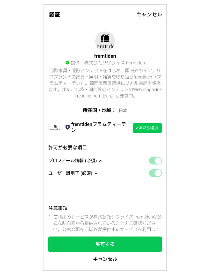 LINEにて認証を許可し、ID連携完了となります。