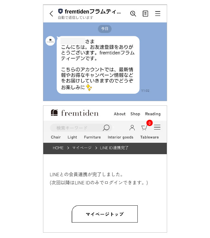 LINEに連携完了のメッセージが届きます。また、OnlineShopでも連携完了画面が表示されます。