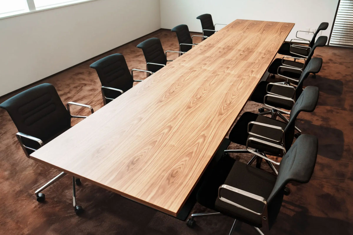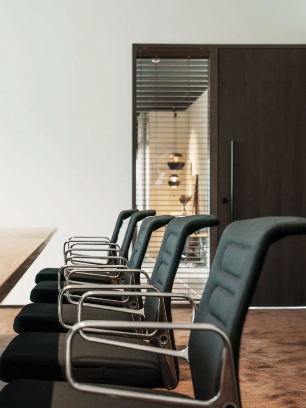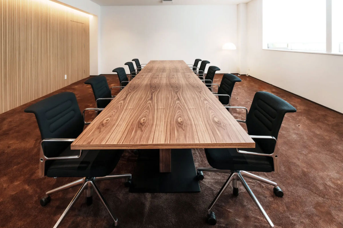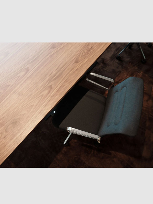 重厚感のあるウォールナットの一本脚のテーブルと、機能美とデザインを兼ね備えたすっきりとしたフォルムのワークチェアが空間を優雅に魅せます。